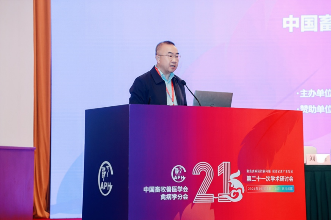 中国畜牧兽医学会禽病学分会理事长刘金华致辞。他明确指出,种源质量、饲料营养以及疾病控制是制约养殖业效能提升的三大核心要素。实践表明,疾病防控仍然是阻碍养殖业持续健康发展的主要障碍。当前,疾病防控领域仍面临诸多挑战与未解的科学难题,亟需广大科研人员深入探索,勇于突破。希望广大科研工作者继续努力拼搏,密切联系一线企业,面向养殖业需求,让科研成果在养殖场开花结果,切实推进养殖业高质量发展。